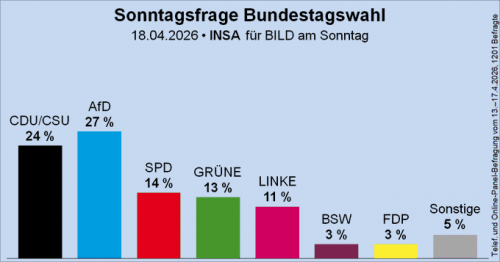 Allemagne. Le parti patriotique AfD est donné premier, à 27 %, avec une avance de 3 points sur la CDU/CSU dans le sondage INSA de ce jour. Le parti de gauche anti-immigration BSW est donné à 3 %.